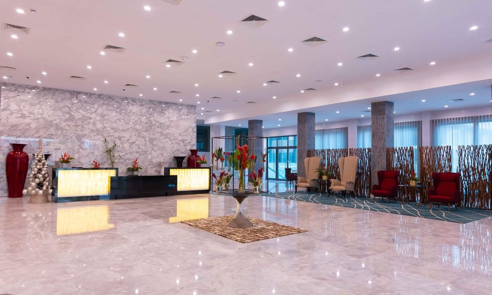 Stop over at the stylish Palms by Eagles Airport City hotel to feast in its elegant restaurants and bask on the pool terrace. Breakfast and Lunch Buffet has resumed with strict Covid protocols. Our complimentary shuttle bus will pick you up when you land at Kotoka International Airport, 1km away, on request. Try local okra crab stew in Wiase Restaurant with a slate-chiselled world map as the backdrop, while wild animals adorn the murals in Safari Bar. Leave your vehicle in our complimentary car