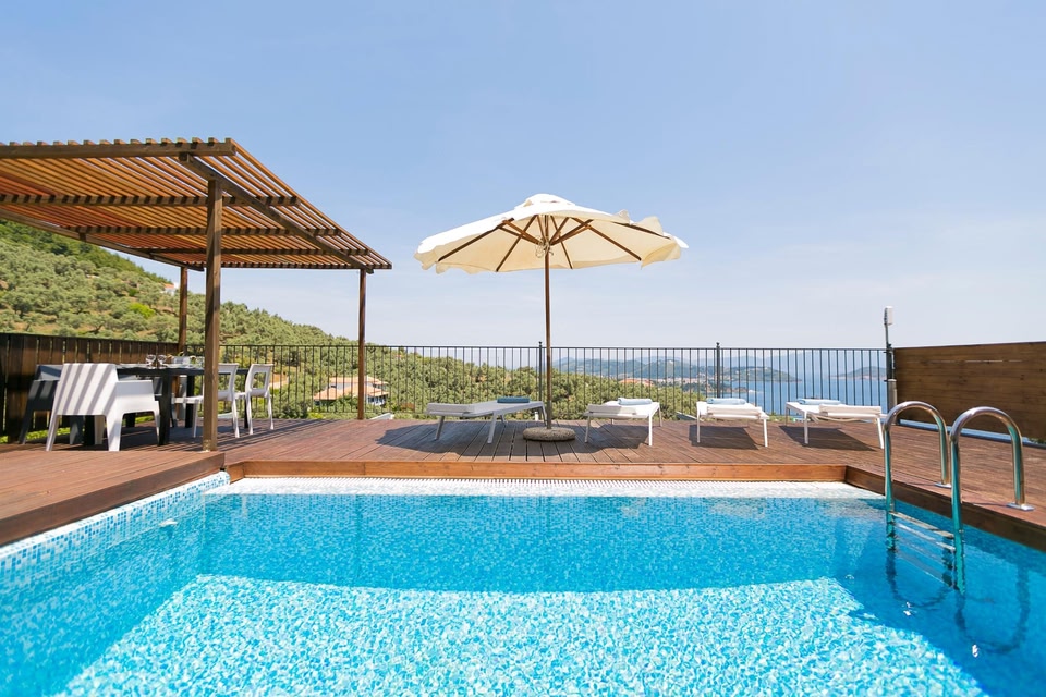 Nestled in the lush Katsaros hill, Skiathos Gea Villas is 1km from Vasilias Beach. A furnished deck with private pool and stunning views is featured in each villa.