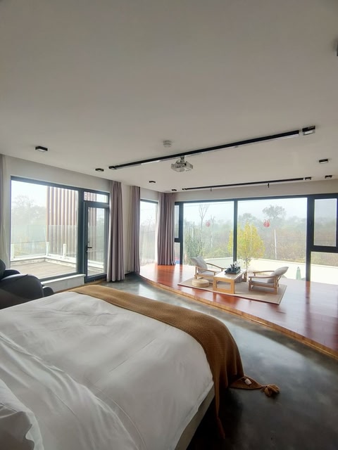 Shangguan Yihao Boutique Inn is located in the suburbs of Yanqing, Boundary stone village, with beautiful scenery and fresh air. It is close to Longqing Gorge, Yudu Mountain and other scenic spots. The total area of the inn is 1800 square meters, with 10 guest rooms built on a mountain, along a river and near a fruit garden. The smallest room is 40 square meters, and the suite area is around 100 square meters. The huge floor-to-ceiling windows, natural and simple color scheme, and maximum extension of the viewing platform... Everything is interpreting our design concept - let the scenery enter the room and feel the beauty of nature up close.
