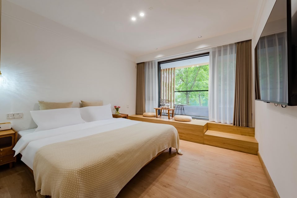 The homestay is located on Xuanyuan Cultural Street in the 5A Scenic Area of Xiandu, Jinyun. It takes 2 minutes to cross the side road and come to the top ten most beautiful Xiandu style greenways in Zhejiang. Walking west along Xuanyuan Street from the homestay for 5 minutes is the Ni Wengdong Lawn and Ni Wengdong Scenic Spots. Continuing westward for another 5 minutes is the popular check-in spot "Xiandu Yandang". Walking east along Xuanyuan Street from the homestay for about 10 minutes is the core scenic area of Xiandu, "Dinghu Peak". The other two distinctive attractions, "Little Red Cliff" and "Xiandu Temple", are also within a 5-minute drive. Free parking is available at the entrance of the homestay, and nearby is the scenic area bus, with very convenient transportation.The homestay is mainly designed in a simple and warm Japanese style, with a tea tasting, reading, and leisure area in the lobby on the first floor, and a private garden at the entrance. The kitchen has complete facilities, equipped with a steam oven, microwave, three door refrigerator, disinfection cabinet... It is very suitable for family gatherings and group building activities. In order to meet the needs of different groups of people, there are various room types to choose from, including warm king bed room, romantic round bed room, comfortable standard room, starry sky parent-child room, oversized terrace parent-child room, and so on. The guest room comes with an independent bathroom, intelligent toilet, and bathroom facilities. The interior decoration design is based on warmth and comfort, and the selection of furniture emphasizes texture and environmental protection, allowing guests to have a comfortable and relaxed feeling of returning to their familiar place.