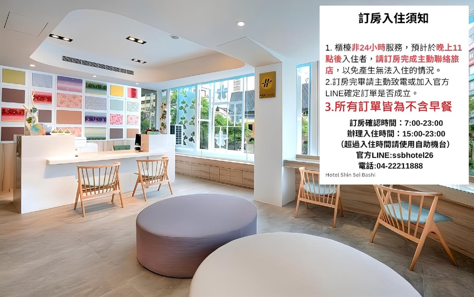 Shin Sei Bashi Hotel offers accommodation in Taichung. Miyahara is just a few steps away. Shin Sei Bashi Hotel is housed a 4-minute walk from Taichung Railway Station. Yizhong Street shopping area is 8 minutes' drive away.